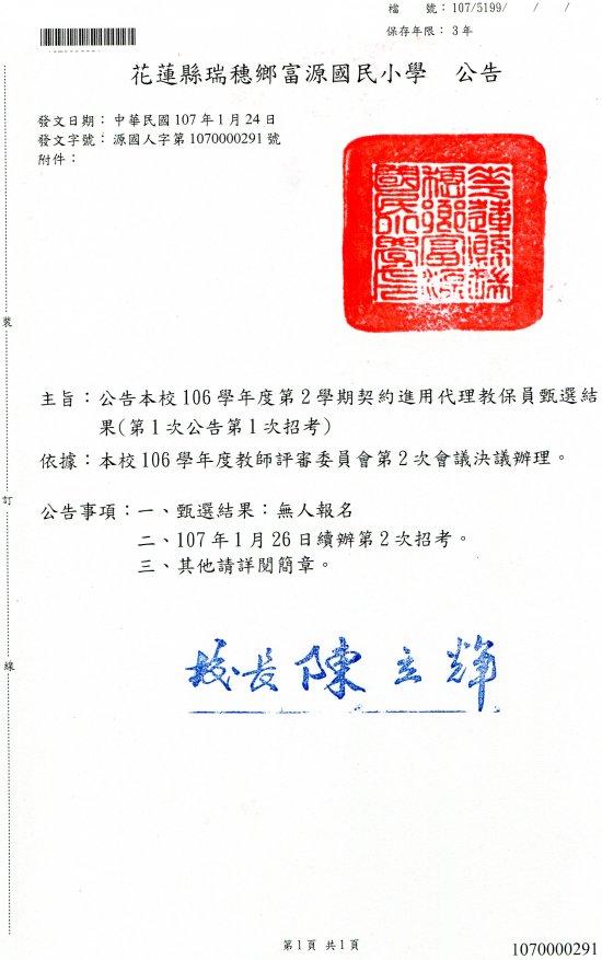 花蓮縣瑞穗鄉富源國民小學110學年度第1次公告普通班代理教師甄選簡章(第第1次公告分5次招考)