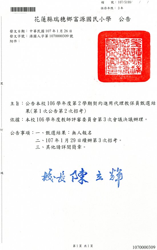花蓮縣瑞穗鄉富源國民小學111學年度第2次公告普通班代理教師甄選第4次招考錄取公告