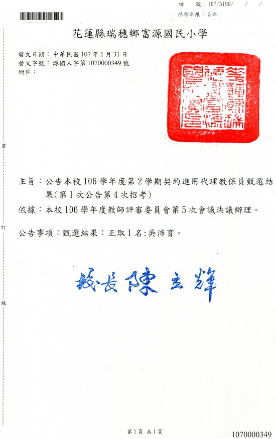 花蓮縣瑞穗鄉富源國民小學111學年度第2次公告普通班代理教師甄選第4次招考錄取公告