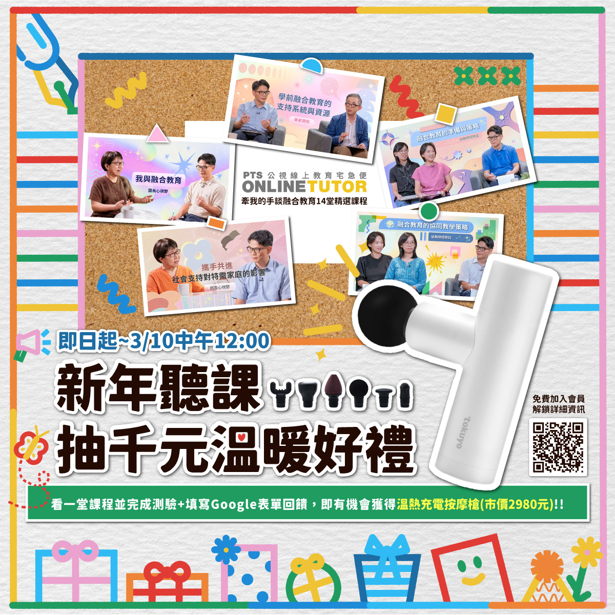(一) | 「PTS Online Tutor公視線上教育宅急便」提供具節目製作品質的研習課程,所有課程皆免費供教師學習。最新14節「牽我的手,談融合教育」系列課程,課程邀請融合教育專家領航,提供融合教學的技巧與策略,更有第一線園長及教師們的教學心得分享。 |