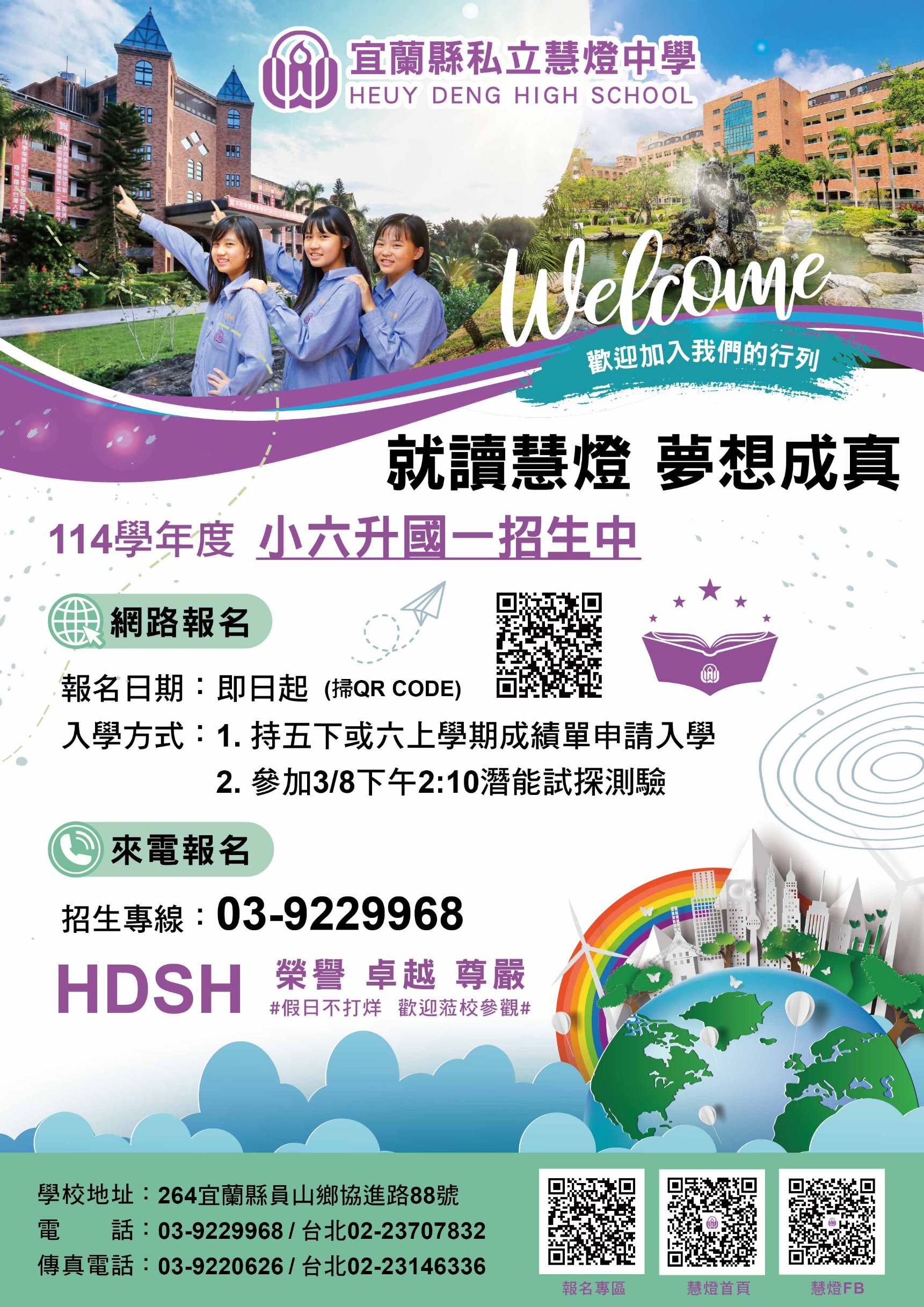 六、 | 活動詳細資訊請參閱附件海報。若有任何疑問,請撥打03-9229968分機147慧燈中學招生處洽詢。 |