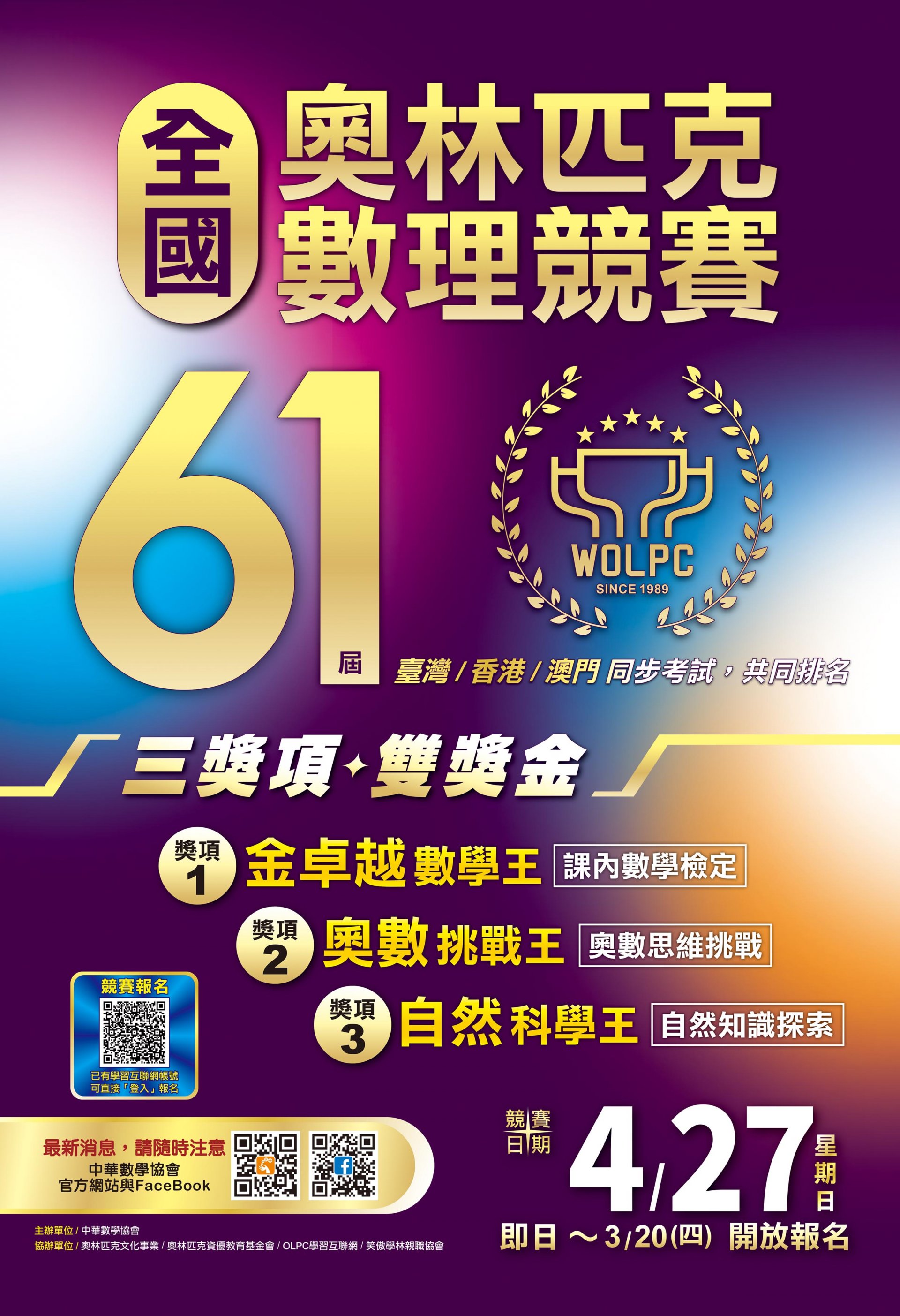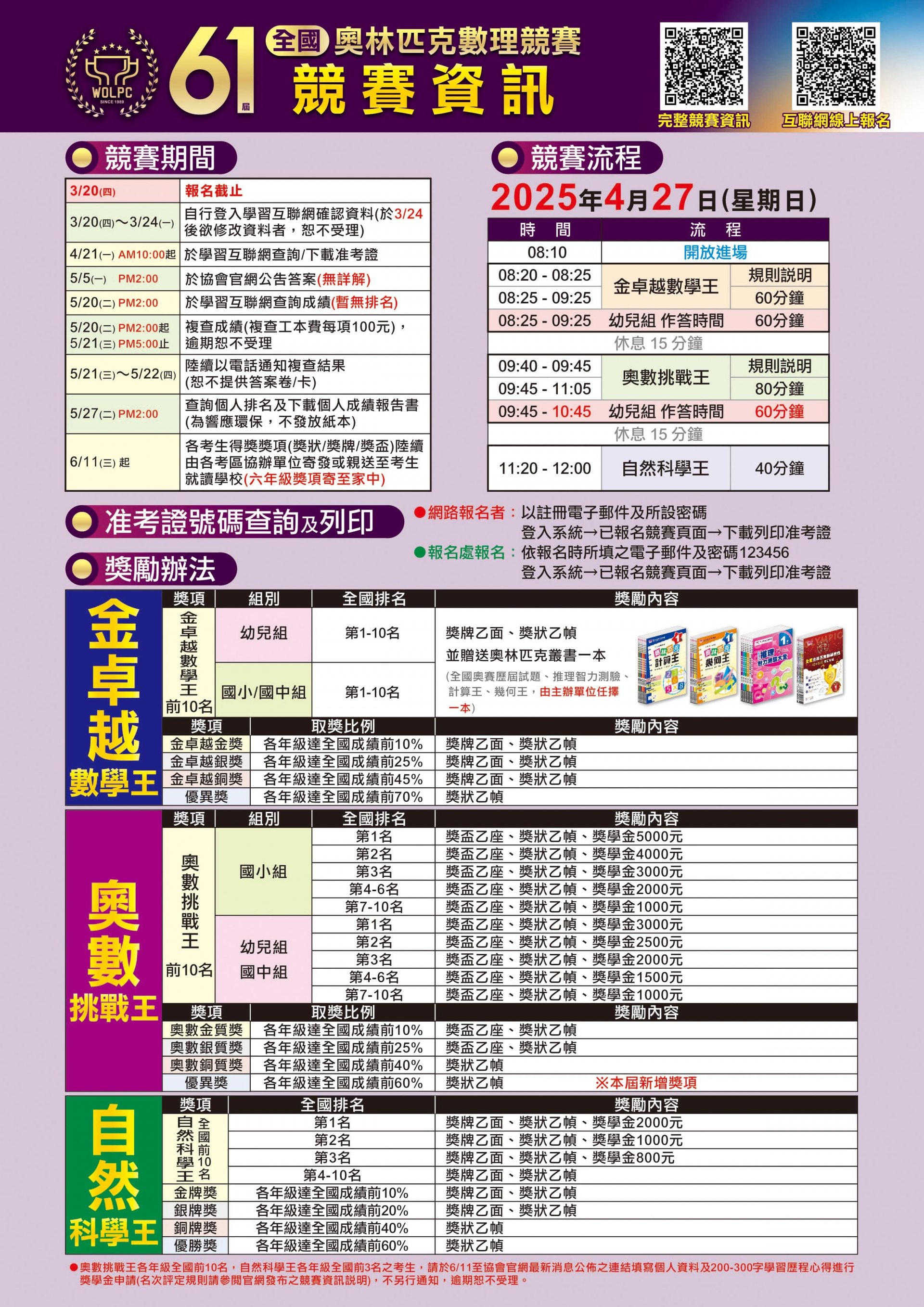 主旨: | 本會為推廣幼兒、國小及國中之數理教育,謹訂於114年4月27日(星期日)舉辦 「第61屆全國奧林匹克數理競賽」,旨在培養學童對數理的興趣,為國家培育優秀人才。建請 貴校公告並推薦學生參加競賽,以提升數理教育,歡迎共襄盛舉。請 鑒核。 |
