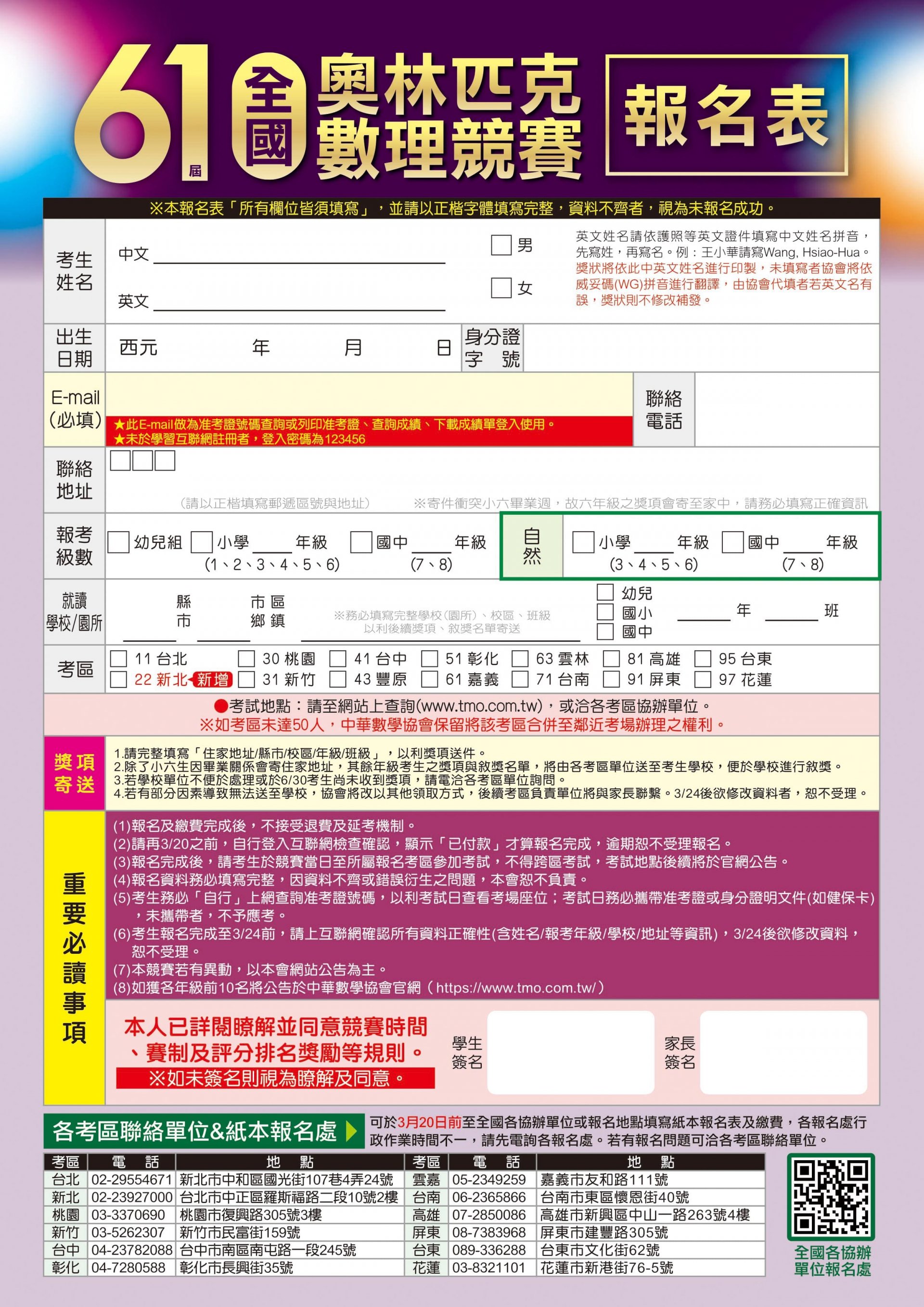 二、 | 檢附「第61屆全國奧林匹克數理競賽」競賽活動簡章,供 貴校參閱。 |