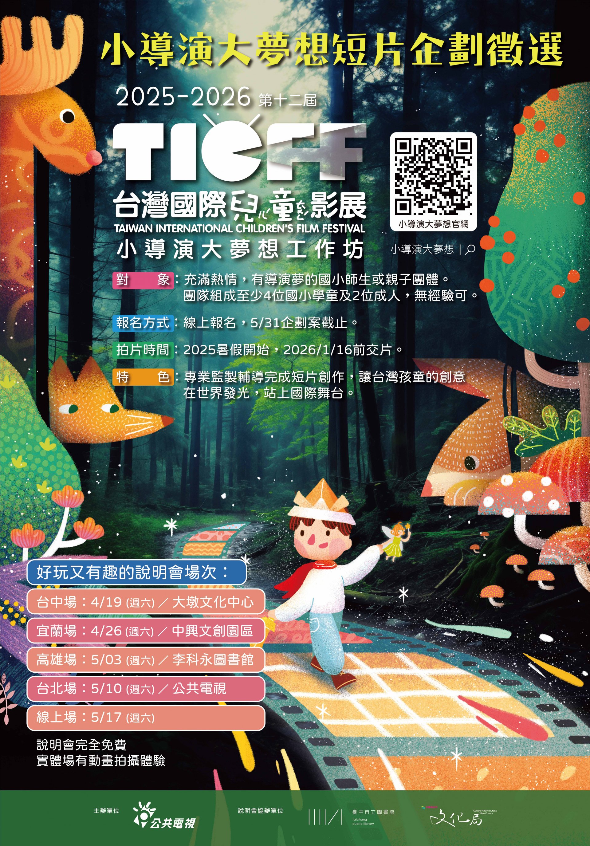 二、 | 公視2025「小導演大夢想工作坊」即將開跑,本會將舉辦「短片創作說明會」說明參加辦法及相關活動內容。說明會場次為2025/4/19台中大墩文化中心、4/26宜蘭中興文創園區、5/3高雄李科永圖書館、5/10台北公共電視、5/17線上場。邀請專業影像工作者教授拍片企劃案撰寫、及小導演團隊分享拍片趣事,歡迎踴躍參加。說明會活動全程免費,請於活動官網線上報名。 |