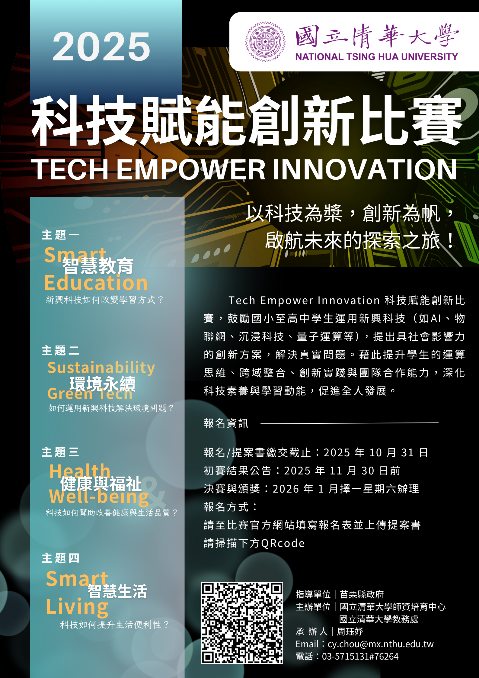 主旨: | 轉知國立清華大學辦理「2025 Tech Empower Innovation 科技賦能創新比賽」,請學校轉知師生並鼓勵踴躍參與,請查照。 |