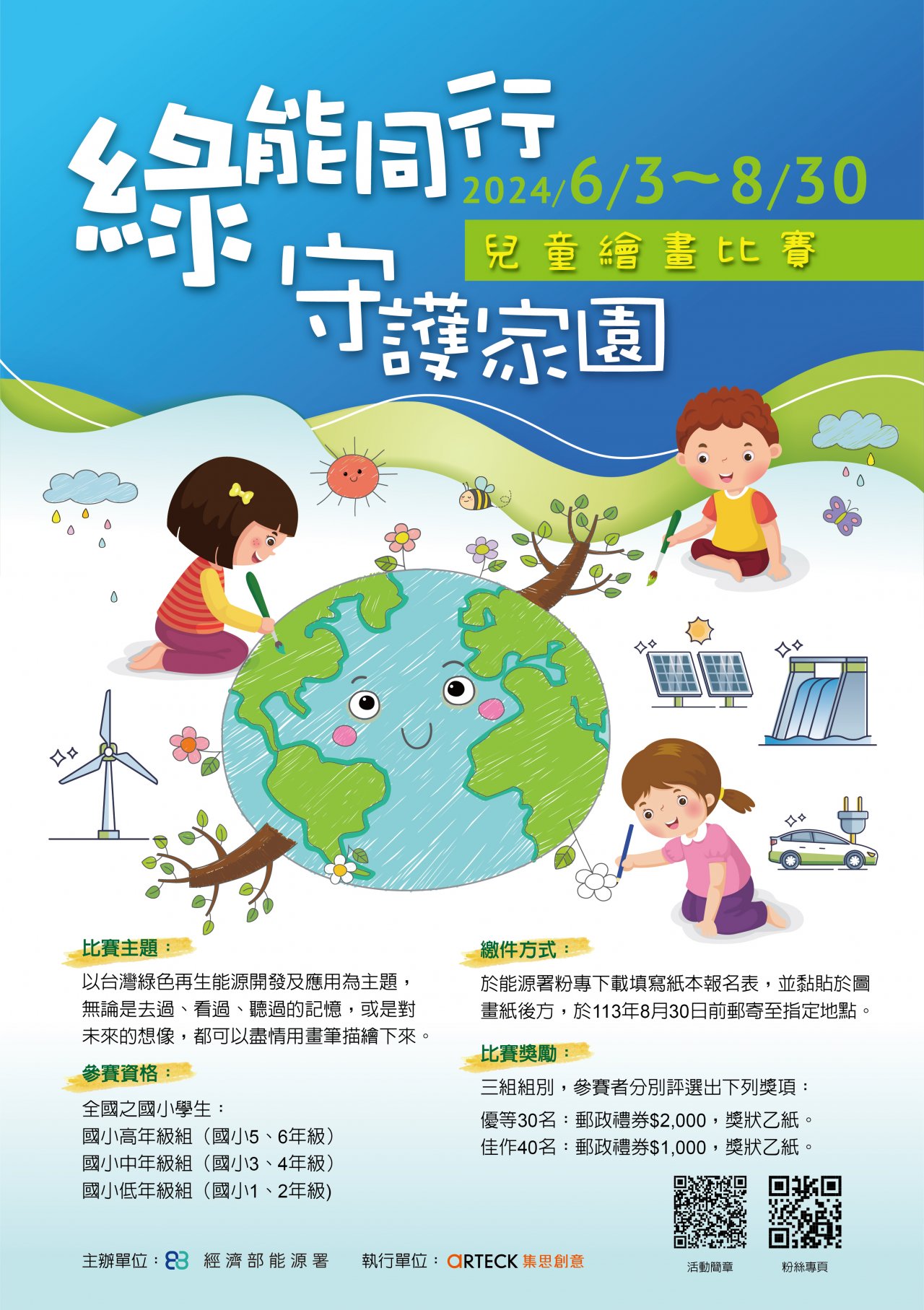 一、綠能發展不僅提升我國能源自主性,及改善環境品質,為 下一代奠定能源永續發展之基礎,本署舉辦2024「綠能同 行 守護家園」兒童繪畫比賽,鼓勵兒童以各式發展中之綠 能為靈感,運用色彩及線條等彩繪方式,展現無限想像力 及創造力。